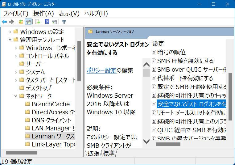 画面左側から「コンピュータの構成」→「管理用テンプレート」→「ネットワーク」→「Lanmanワークステーション」と辿り「安全でないゲストログオンを有効にする」を開きます。