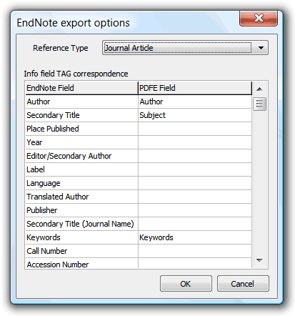 これは、作成する参照タイプを選び、PDFE メタデータ項目を、EndNote 項目写像の図表に定義するために、使用されます。