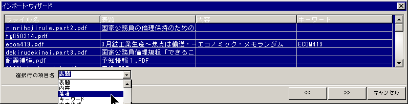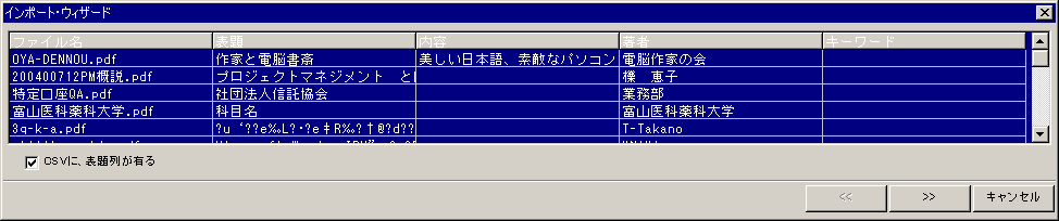 メニューの「ファイル」→「インポート」で、csv形式(カンマ区切りテキスト)から、PDF Explorer のデータベースに登録するにデータを、取り込むことができます。このデータは、PDFファイルの更新にも使うことができます。