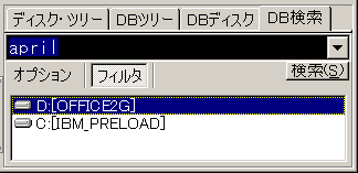「検索」ボタンを押して検索した結果、複数のドライブに該当する文書があった場合は、「フィルタ」ボタンが表示されます。下のドライブ・リストで選択して、検索結果を絞り込むことができます。
